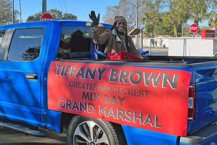 Tiffany Brown, parade Grand Marshal leading the Greater Ridgecrest Martin Luther King Jr. Day parade.